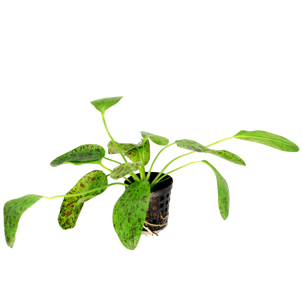 Echinodorus Green Ocelot - Jest to jeden z bardziej efektownych gatunków żabienicy, a jednocześnie łatwy w uprawie. Jasnozielone liście w ciemnoczerwone lub brązowe plamy tworzą imponujący efekt w akwarium.