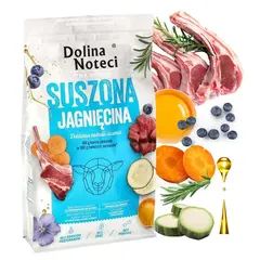 Dolina Noteci Premium karma suszona dla psa - jagnięcina: ✅ karma pełnoporcjowa suszona dla dorosłych psów wszystkich ras, ✅ podstawą składu karmy suszonej są mięso i podroby (80% łącznej ilości surowców), z dużym - 40% udziałem tkanki mięśniowej...